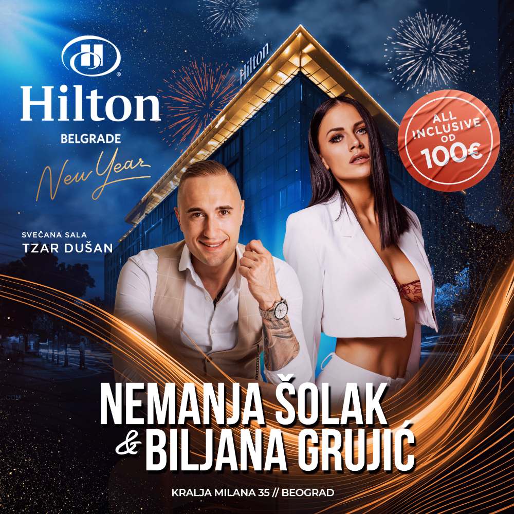 Nemanja Šolak i Biljana Grujić će se pobrinuti da Nova godina hotel Hilton Beograd bude magično, nezaboravno iskustvo, ispunjeno najlepšim trenucima, najvećim hitovima i novogodišnjom čarolijom! Publika je dobro upoznata sa njihovim spektakularnim nastupima, sjajnim vokalima i harizmatičnom scenskom energijom, koja svaku pesmu pretvara u pravi muzički doživljaj i garantuje atmosferu za pamćenje.